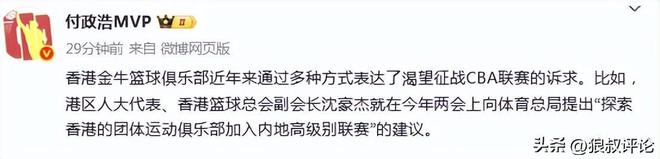 媒体人付政浩点评说道:香港金牛篮球俱乐部近年来通过多种方式表达了渴望征战CBA联赛的诉求。比如,港区人大代表、香港篮球总会副会长沈豪杰就在今年两会上向体育总局提出“探索香港的团体运动俱乐部加入内地高级别联赛”的建议。