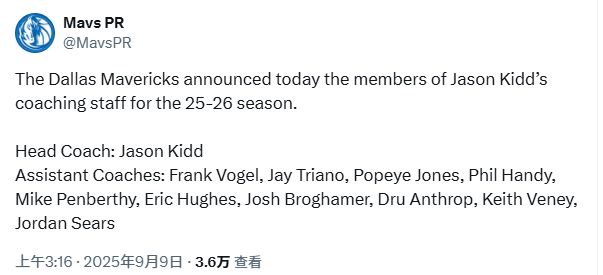 北京时间9月9日,达拉斯独行侠队的球员阵容很豪华,如今他们已通过官方正式确认了2025-26赛季主教练杰森-基德的教练组名单,同样是阵容豪华。