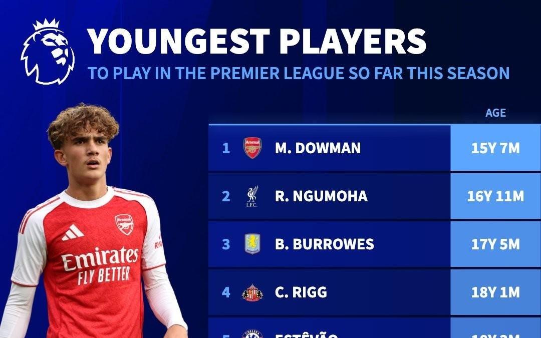 英超本赛季最年轻出场球员TOP10:道曼居首,阿森纳占3席