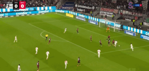 下半场,拜仁依然不断创造机会。第54分钟,凯恩射门,球击中了立柱。随着比赛不断推进,法兰克福加强了攻势,想挽回败局。第84分钟,格雷罗在后场断球后发动反击,把球斜传给从左路插上的迪亚斯,迪亚斯加速甩开了防守球员,小角度爆射破门,比分变成3 - 0!