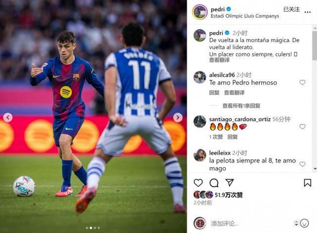 佩德里当选本场比赛最佳球员,赛后他在社交媒体上晒出比赛照片,配文:“重回蒙特惠奇球场,重返西甲榜首。一如既往的快乐,巴萨球迷们。”