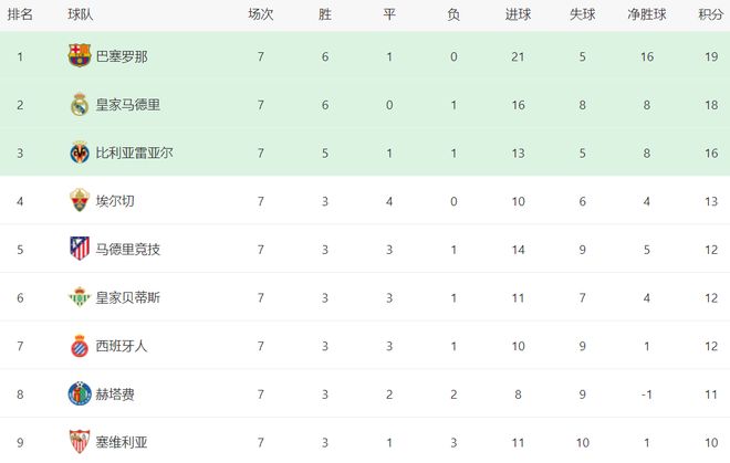 西甲榜首易主。巴萨6胜1平保持不败,拿到19分,超越皇马登上了榜首位置。皇马6胜1负,拿到18分,以1分的劣势排名第2。第3的是比利亚雷亚尔,拿到了16分。大黑马埃尔切7场不败,3胜4平的战绩极其出色,拿到13分,排名第4。要知道埃尔切的总身价只有6495万欧元,却取得如此出色的战绩。马竞以12分排名第5。皇家贝蒂斯和西班牙人也都是12个积分。