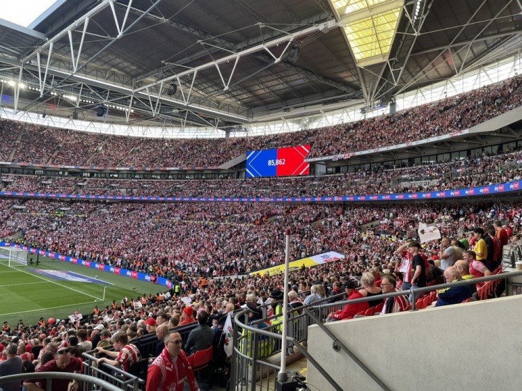 5月27日报道 英冠升级附加赛决赛,南安普顿1-0击败利兹联,圣徒重回英超。温布利现场大屏幕显示,本场比赛到场观战的人数达到85862人,而温布利球场的容量为90000人。