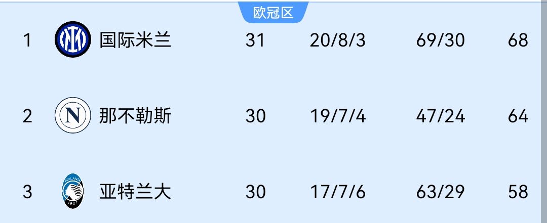 意甲夺冠概率:国米76.3%,那不勒斯23.3%,亚特兰大0.4%