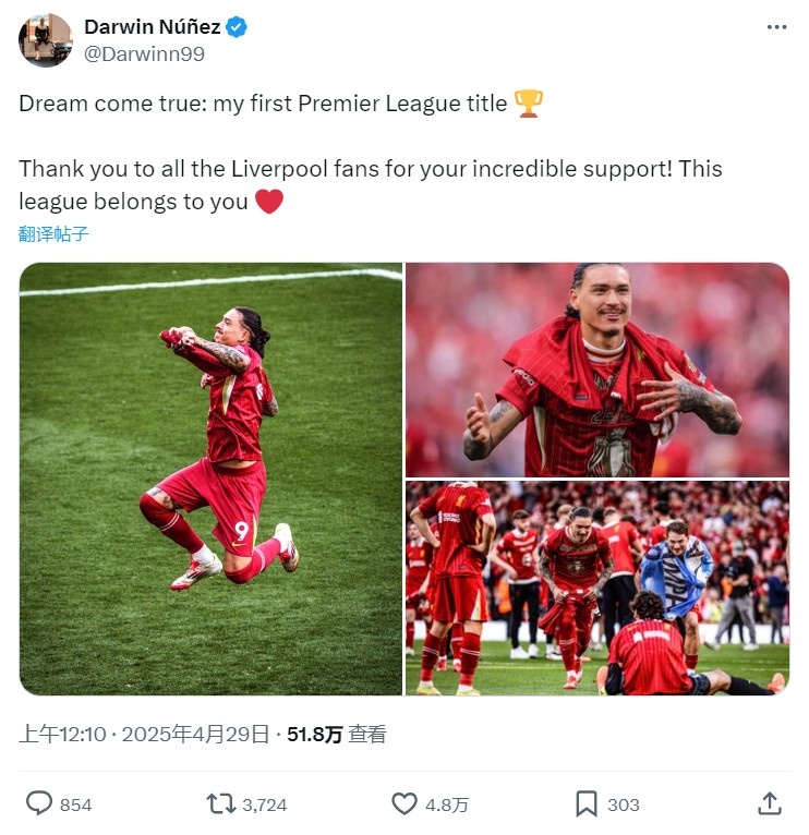 努涅斯配文写道:“梦想成真:这是我生涯第一个英超冠军。感谢所有利物浦球迷的鼎力支持!联赛冠军属于你们!”