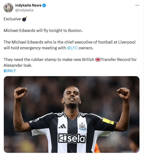 俱乐部CEO(首席执行官)迈克尔-爱德华兹今晚将飞往波士顿,他将在那里与俱乐部老板们举行紧急会议。并且向老板申请批准,为伊萨克开出新的英国创纪录的报价。