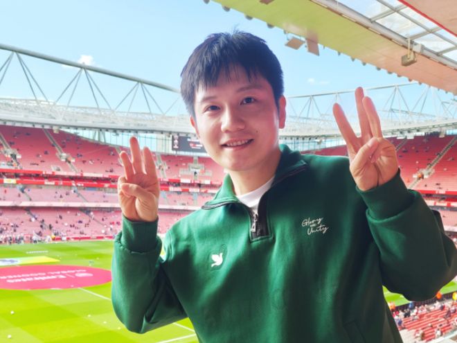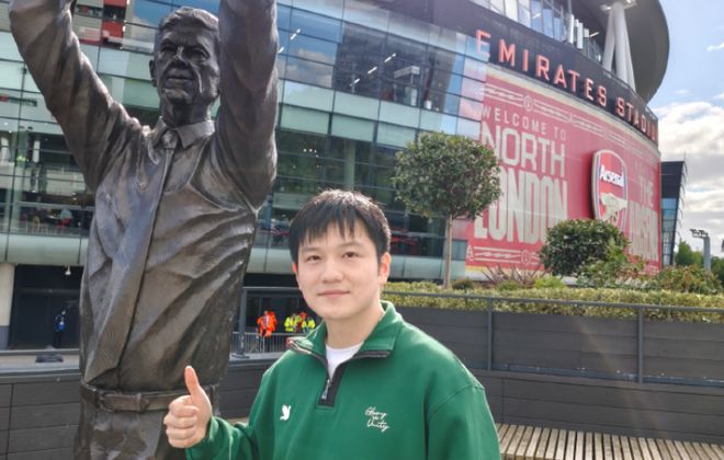 酋长球场外,有阿森纳俱乐部前功勋教练温格的雕像。樊振东站在雕像前,竖起大拇指,脸上浮着微微的笑容。