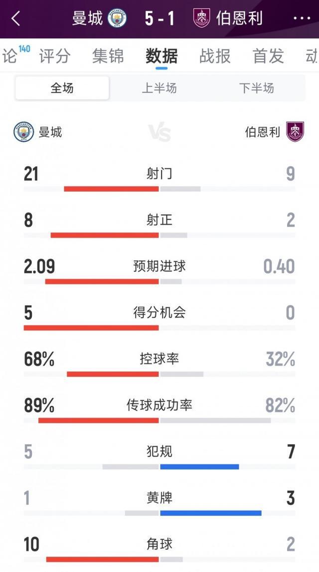 直播吧9月28日宣 在本轮英超,曼城5-1大胜伯恩利,以下为双方全场数据对比: