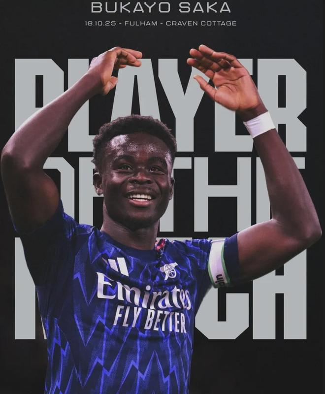 官方:萨卡被阿森纳官方评为了全场比赛最佳球员。