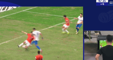 上半场补时阶段,克雷桑禁区内射门被阻挡,球打在刘军帅的手上。主裁判回看慢镜头之后判罚点球,克雷桑主罚点球破门,将比分改写为2比1!