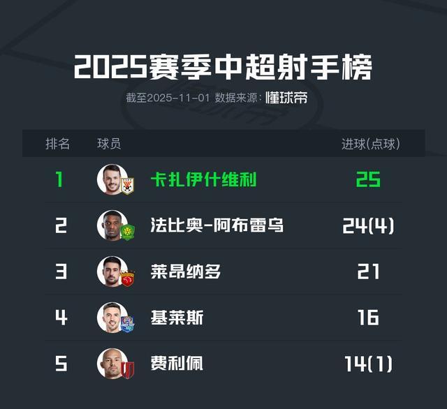 中超第29轮,瓦科破门+失点,法比奥双响,两人进球数分别来到25粒和24粒,射手榜第三名的莱昂纳多攻入21球,争夺金靴的可能性不大。